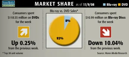 For the week ended November 9, Blu-ray Disc sales accounted for only 8% of home video sales versus 92% for DVD per numbers released by Home Media Retailing today. In the past several months, Blu-ray had accounted for anywhere from 10 to 15 percent of all sales.