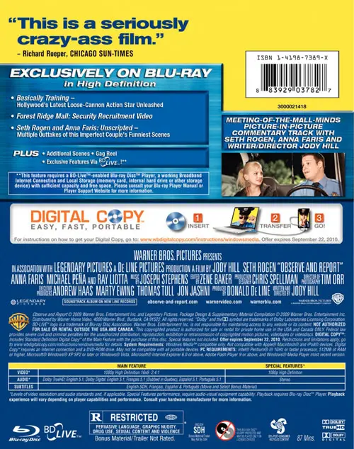 On Blu-ray, Observe and Report will be presented in 2.35:1 1080p video and 5.1 Dolby TrueHD audio. Several bonus features are exclusive to Blu-ray and offered in HD as noted below.