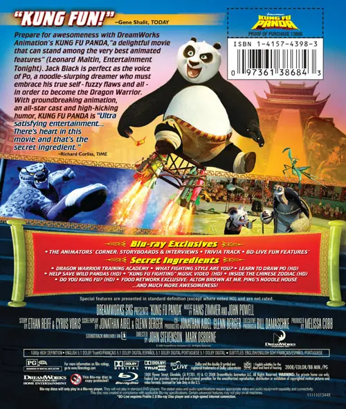 Kung Fu Panda will be presented in widescreen 1080p video and 5.1 Dolby TrueHD audio.